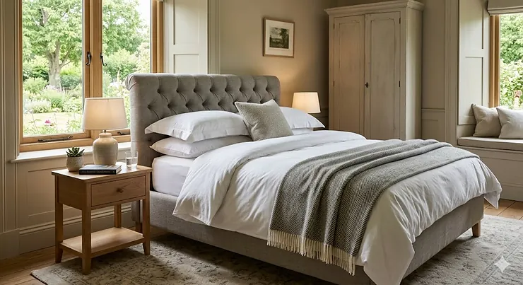 Britain’s climate is fundamentally damp — not dramatically wet like a rainforest, but persistently humid throughout autumn, winter, and much of spring. Upholstered beds with fabric wrapping the frame require adequate bedroom ventilation to prevent that musty smell developing in the fabric. Ground-floor bedrooms, north-facing rooms with limited sunlight, and Victorian/Edwardian properties with solid walls (lacking cavity insulation) prove particularly challenging.